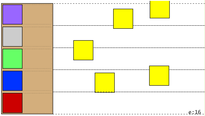 We have a stage on the left, with five players (the various multi-colored squares at the left (from top to bottom Funkmouf, Gravelthroat, Leper Skinz, Bass Boy, Frank (colors based on their background colors in FMB media)), who are charged by ninjas (the yellow squares) distributed across five lanes. The ninjas currently have a chance of trying to attack with ninja stars, though they are sadly unable to follow through just yet.